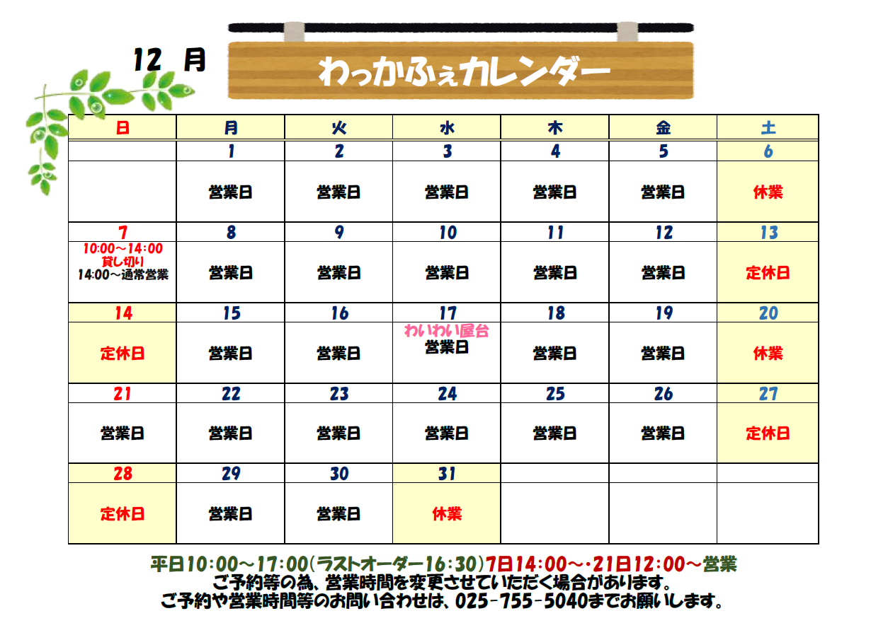 TOP > お知らせ一覧 > わっかふぇ > わっかふぇ12月営業カレンダー