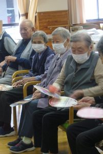 うちわにお手玉を乗せて、落とさないようにお隣りへ♪