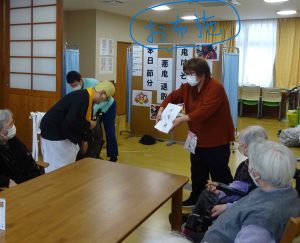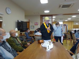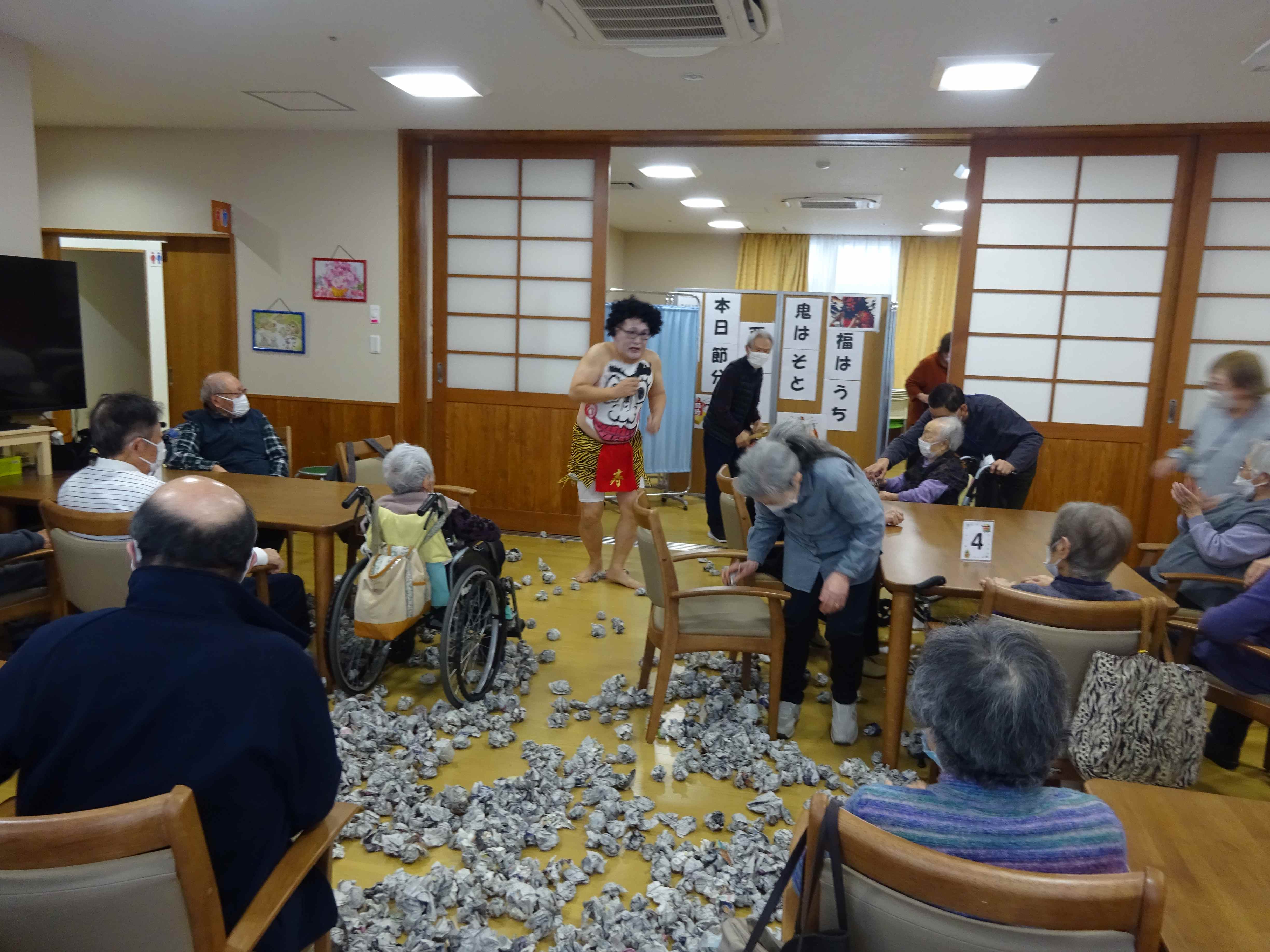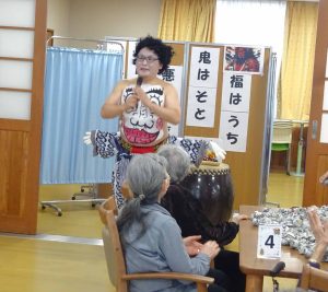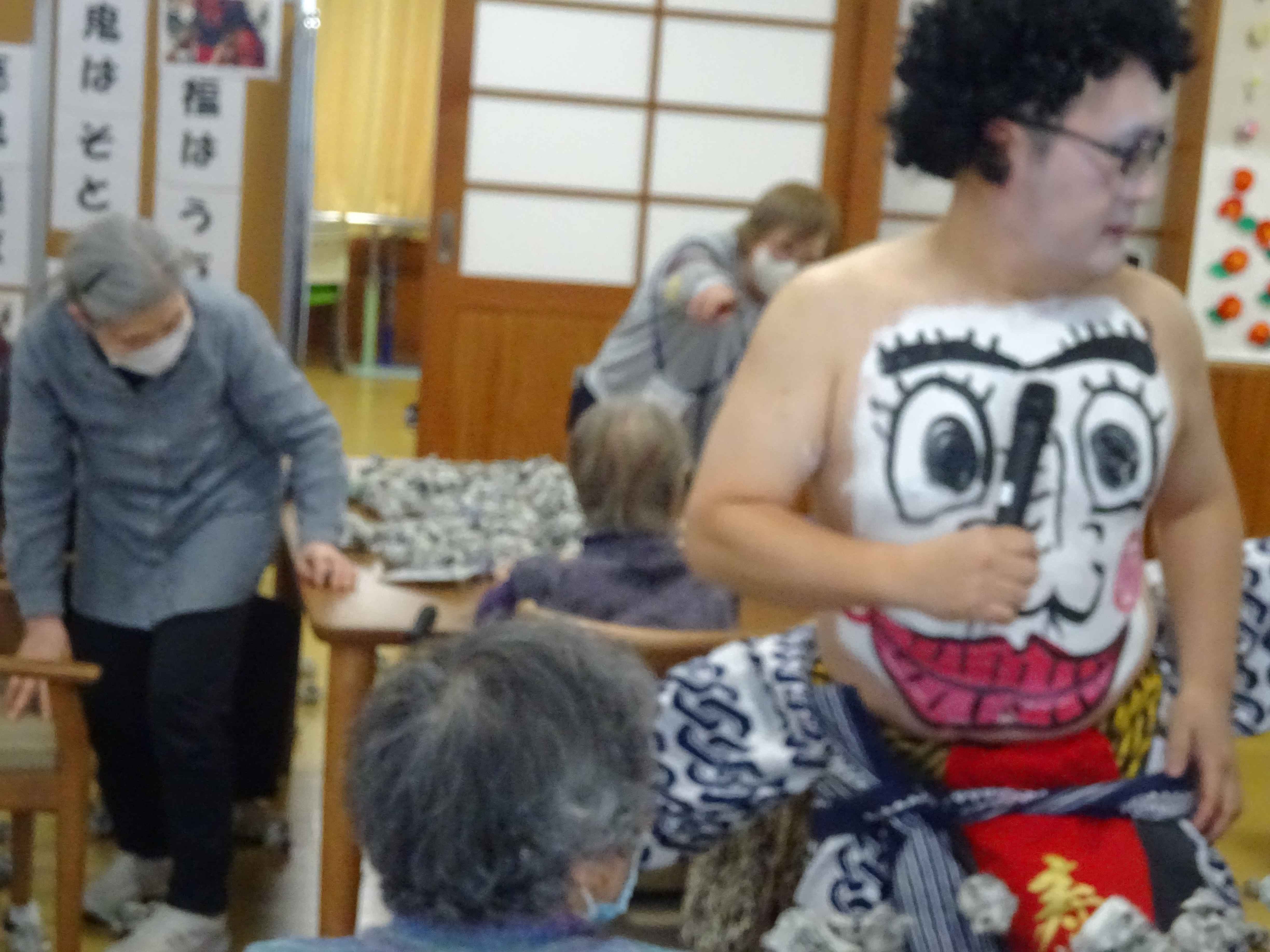 2026年2月7日 これは節分なのか~デイサービスセンター三好園~ ケアホームげじょう 恒例の変な鬼が登場!これは鬼なの? 変な鬼が去った後はありがたいお坊さんによる説法とお祓い。 鬼は仏と表裏一体。心の中の鬼を追い払いましょう。 春はすぐそこ。