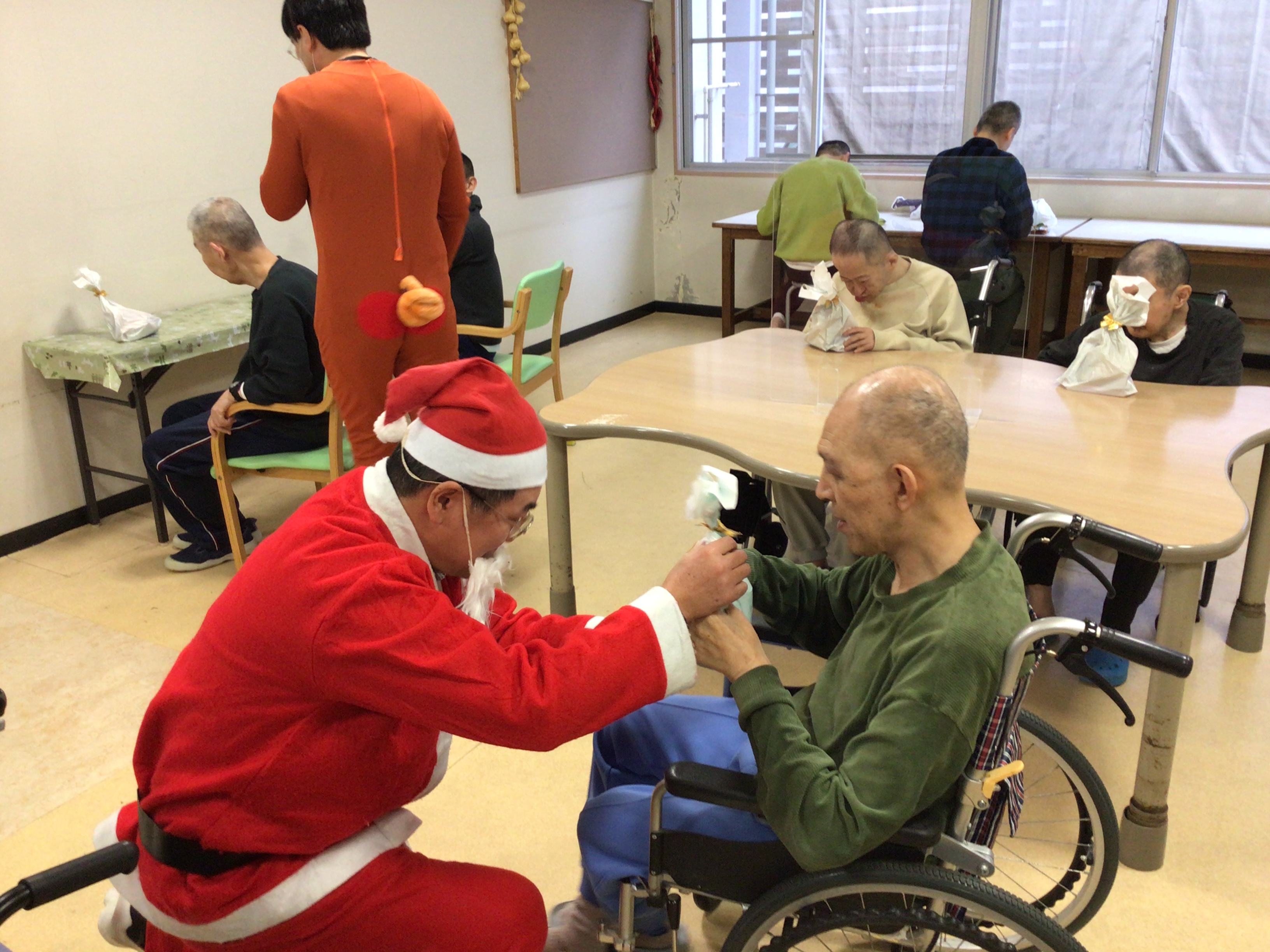12/25にクリスマス会を行いました。お菓子をサンタとトナカイ?に配って頂きました。