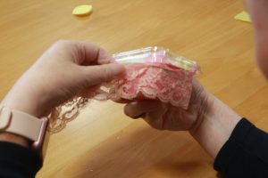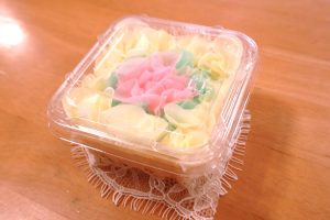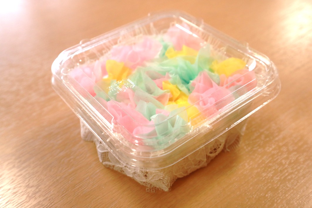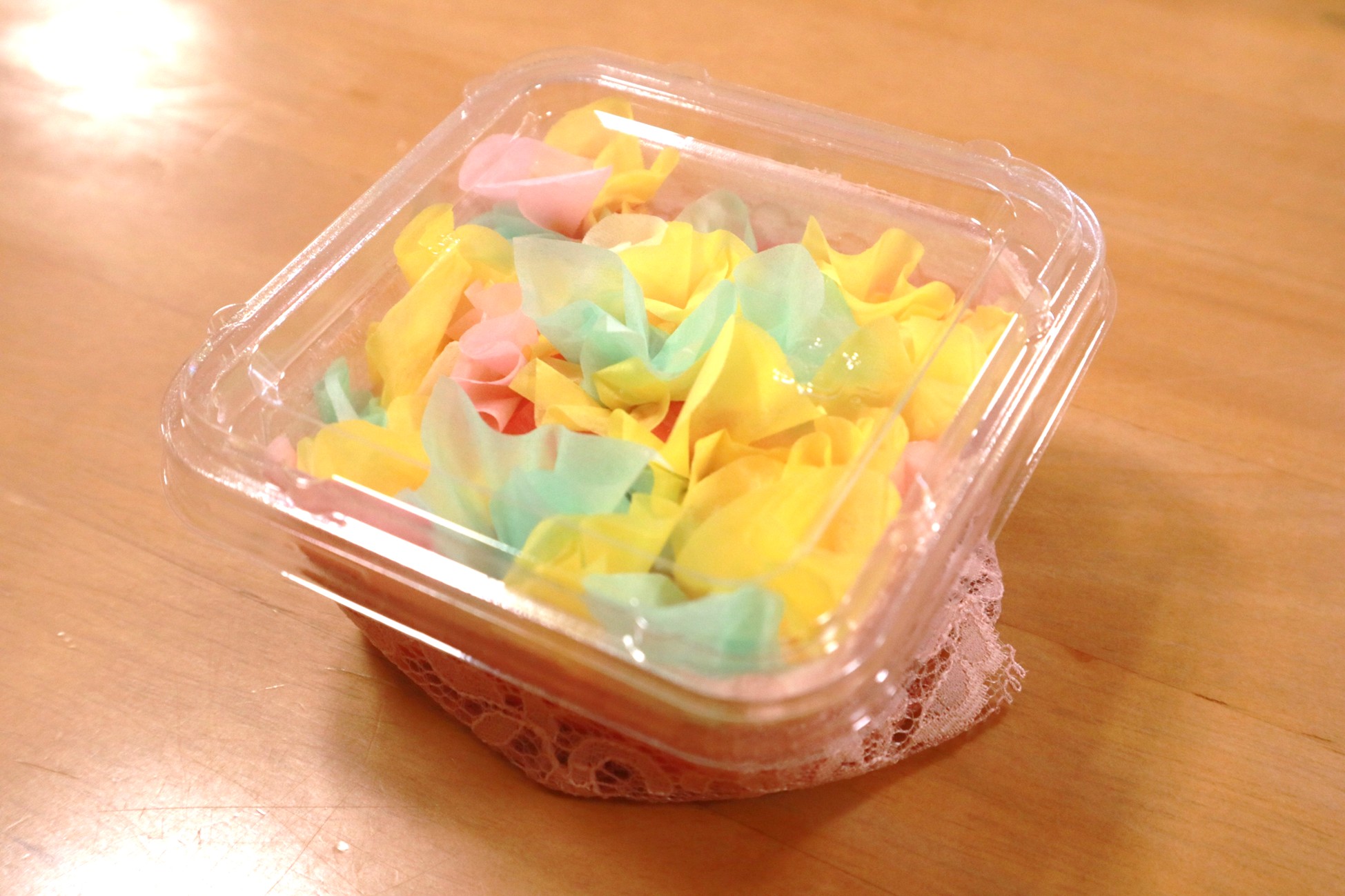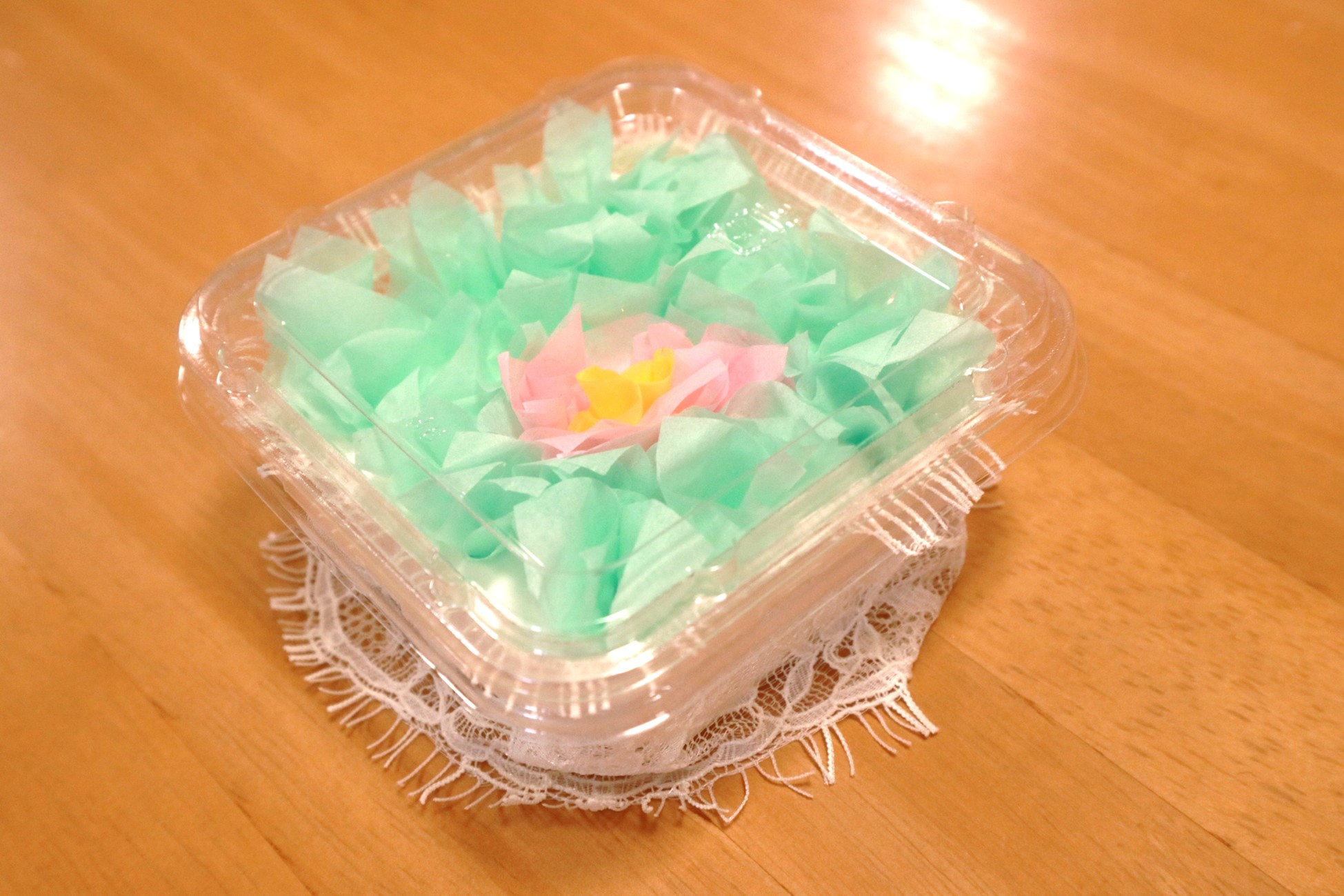 最後に容器にふたをかぶせ・・・まわりにレース柄のリボンを飾り付けると完成です!!