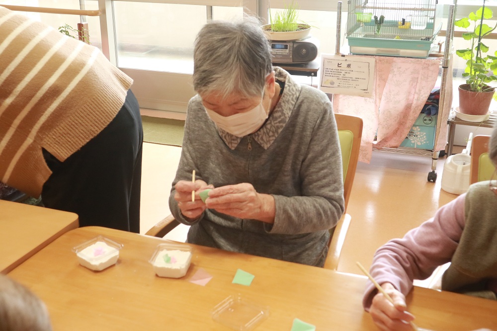 春の陽気を感じるこの頃ですが、3月の「手わいさクラブ」では紙粘土にお花紙を一つひとつ差し込んで、お花を作りました。