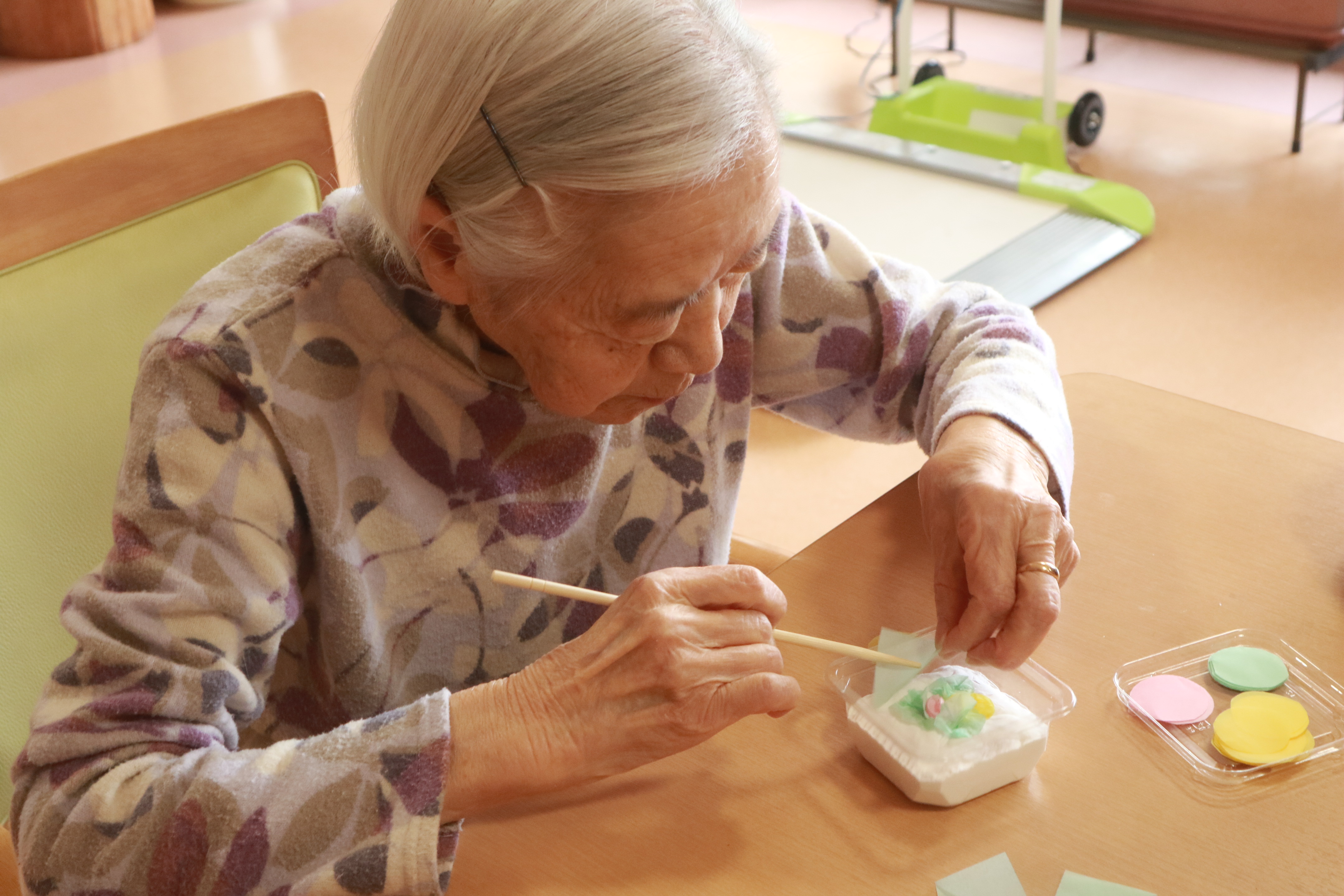 容器にカラフルな紙粘土を敷き詰め、入居者の皆さんに好きな色のお花紙を選んでいただき、