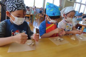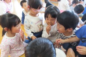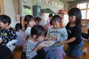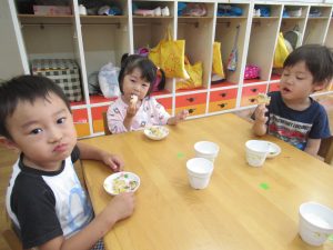 こども園では、月一回《食べるの大好きわくわくデー》と題して、色々な食材に興味や食べる事に関心が持てるように