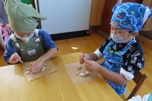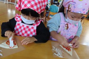 集会で話を聞いた後、皆でクッキング!午後のおやつの《きのこピザ》を作りました。