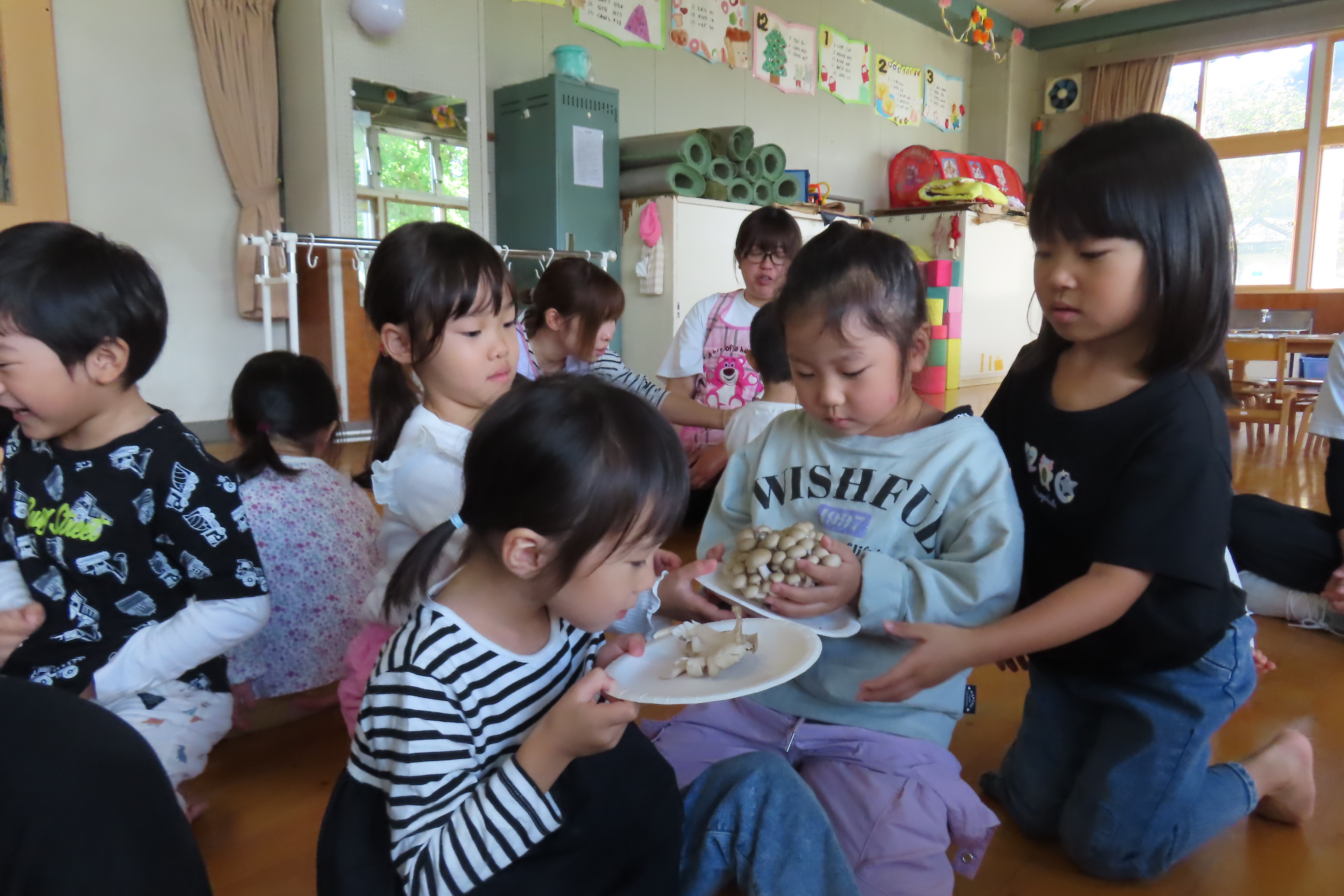 どんな種類があるのかシルエットクイズをしたり、実際にきのこに触れてみました。