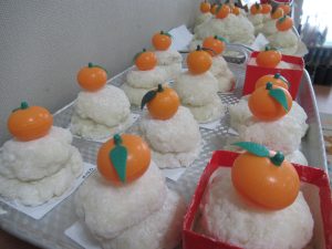 できたお餅でミニ鏡餅を作りました。お餅が手にくっつく~💦