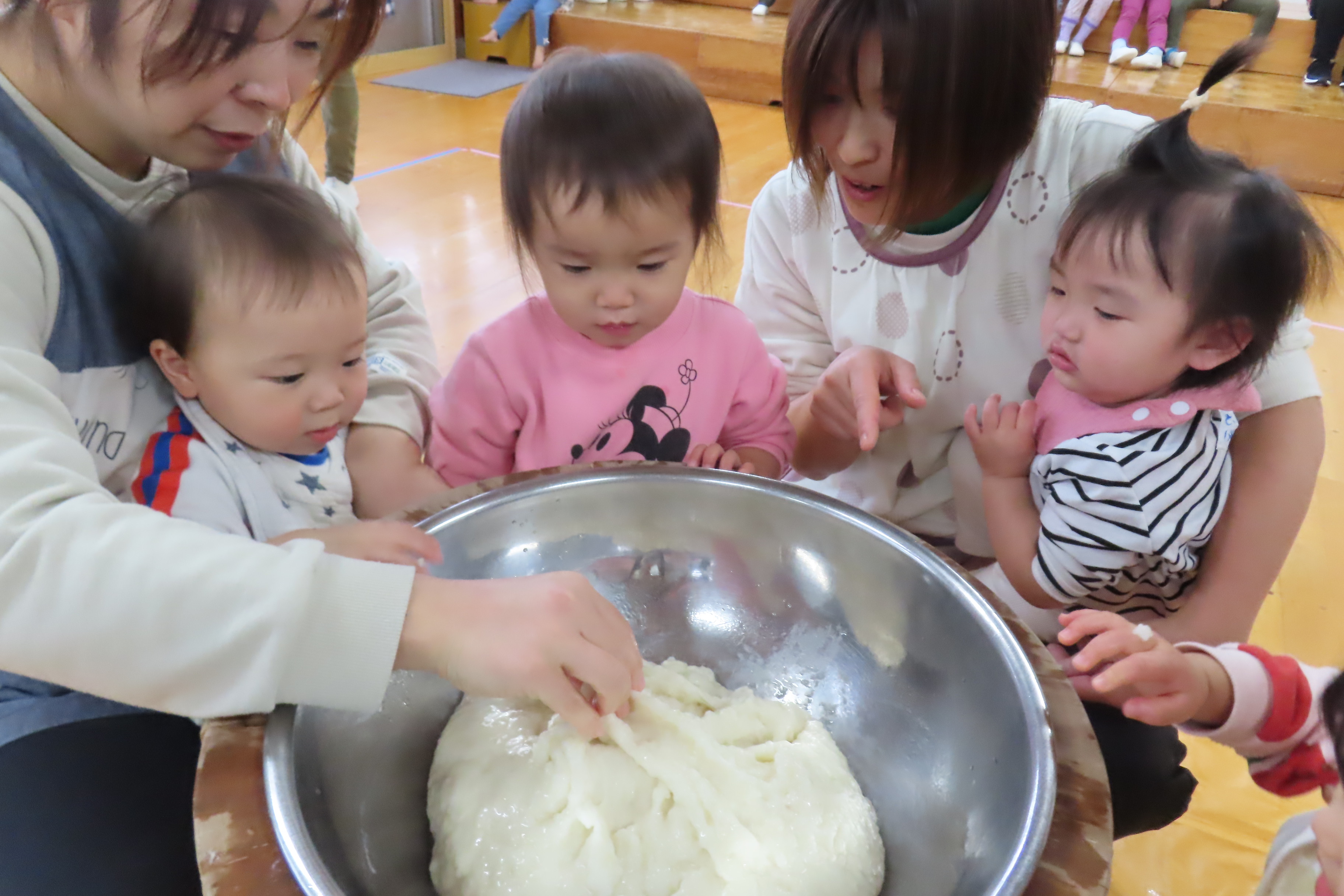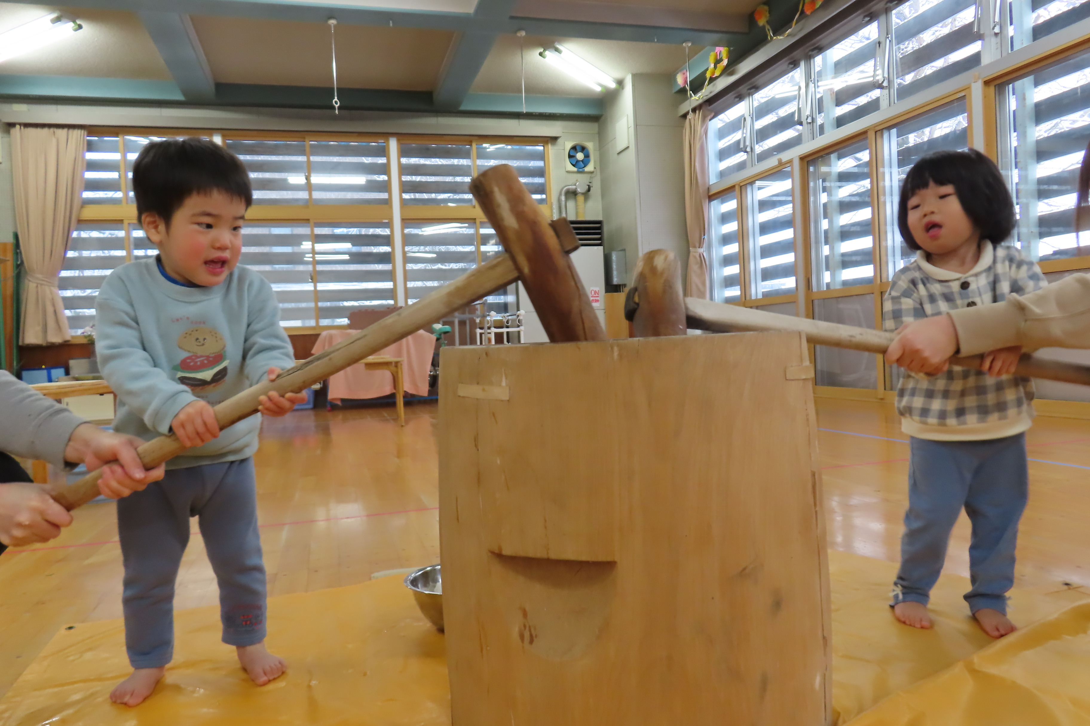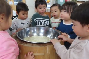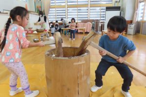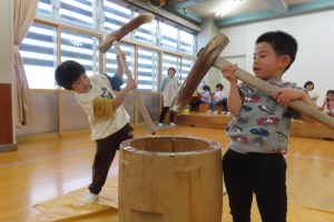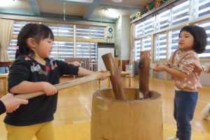 実際に杵と臼を見ることも少ないので前日から子ども達も「はやくしたい!」とやる気満々!!