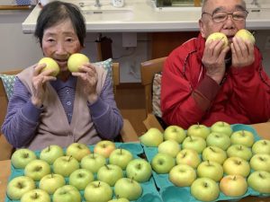 「いい香りだね~」「青りんご、トキという品種なんだ」と、両手に持ちながら、りんご談義。