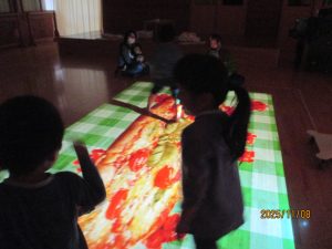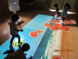 『オミ・ビスタ3』とは…!?テーブルや床に映像を投影して、触ったり近づいたりすると音が鳴ったり、反応していろいろな感覚遊びが楽しめる機械です。
