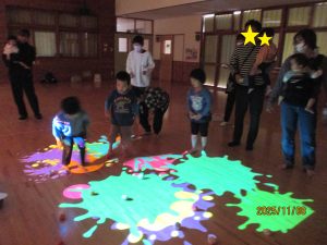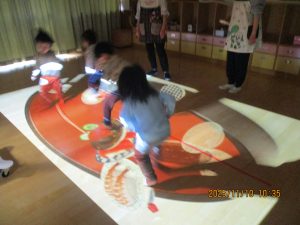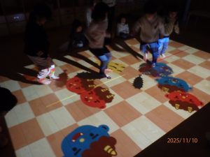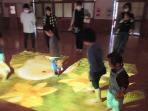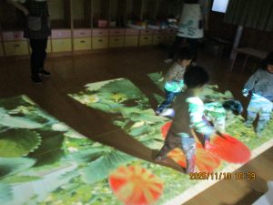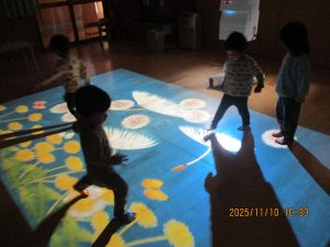『オミ・ビスタ3』とは…!?テーブルや床に映像を投影して、触ったり近づいたりすると音が鳴ったり、反応していろいろな感覚遊びが楽しめる機械です。