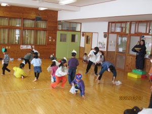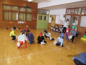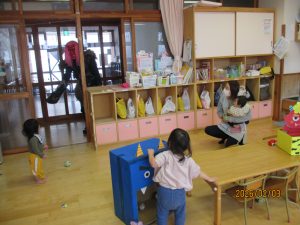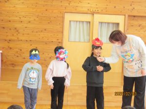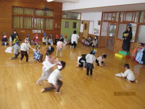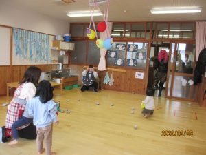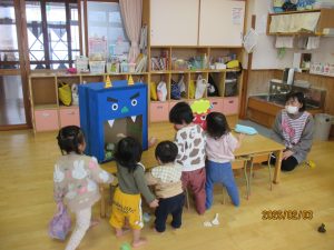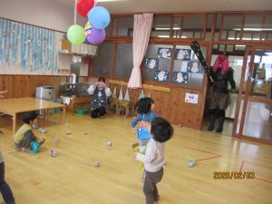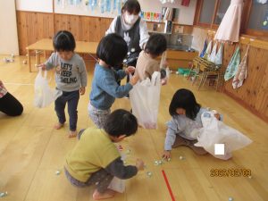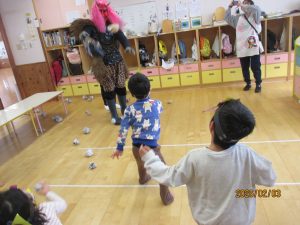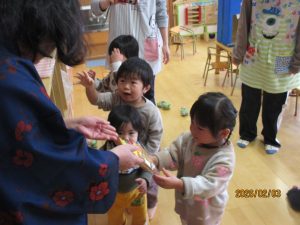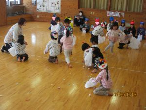 今年は久しぶりに福まきを行いましたよ。りす組さんは保育室、うさぎ・ぱんだ・ぞう組さんはホールで行いました。「おには~そと!ふくは~うち!」とみんなのかけ声から福まきスタートです。子ども達のあまりの素早さに写真もブレてしまいましたが…たくさん福を拾って子ども達はとっても嬉しそうでした。