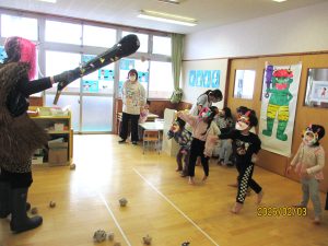 2月3日は節分の日。先日、鬼から2月3日にうえのこども園に遊びに行くという手紙が届いたので、子ども達がいろいろな意味でドキドキしていた日でした…。