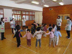 なべなべそこぬけは、歩ける0歳児から年長児まで行いました。大きいクラスの子2人と小さいクラスの子1人のグループになって行いました。大きいクラスの子が上手にリードしてくれましたよ♡