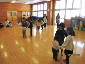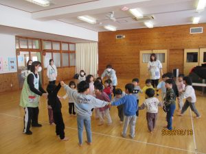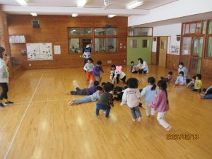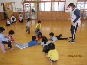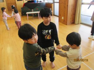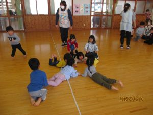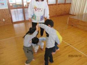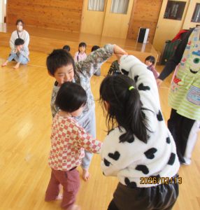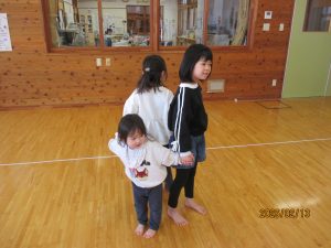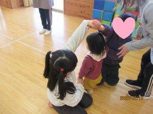 なべなべそこぬけは、歩ける0歳児から年長児まで行いました。大きいクラスの子2人と小さいクラスの子1人のグループになって行いました。大きいクラスの子が上手にリードしてくれましたよ♡