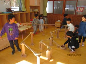 カーブで球がはじかれたら木を置いたり装置の高さを変えたりなど、高橋さんのしている事を見て学んで自分たちで“やってみよう!”と工夫して遊んでいました。