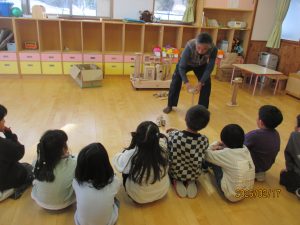 こども園を代表して、ぞう組さんが遊び方を教わりました。                                   初めて見る装置に目が釘付け!!興味津々で身を乗り出して話を聞いていましたよ。