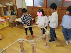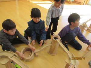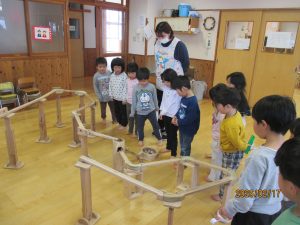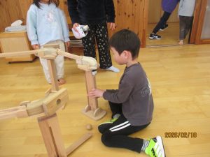 高橋さんとぞう組さんが作ったピタゴラを見て遊ぶことを楽しみにしていた、ぱんだ・うさぎ組のお友だち。翌日、朝の自由遊びの時間に早速遊んでいました!ぞう組さんは「昨日と違うのにしよう!」とお友だちと協力して変化を楽しんでいましたよ。