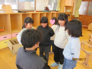 ~おまけ~                                                            木の球を手にかくして「ど~っちだ!?」と市のイケメン職員さんとキャッキャ♡していたぞう組女の子でした😁