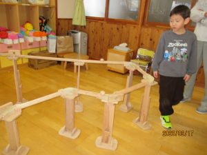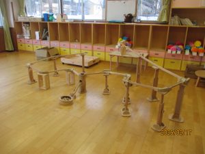 カーブで球がはじかれたら木を置いたり装置の高さを変えたりなど、高橋さんのしている事を見て学んで自分たちで“やってみよう!”と工夫して遊んでいました。