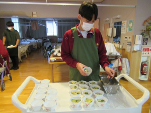 2025年10月21日 中学生福祉体験② よしだ 春に引き続き、川西中学の3年生が福祉体験に来てくれました。 まずはよしだ恒例の「とろみ体験」から。 なぜとろみが必要なのかを栄養士から説明した後、実際に味の変化を体感してもらいました。 ご利用者と触れ合ったり、食事の支度など実際の業務も体験。 その他、入浴用リフトの体験等も行いました。 当施設では福祉の仕事に興味を持っていただくために、体験やボランティアを随時受け入れています。 お気軽にお問い合わせください。