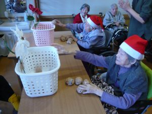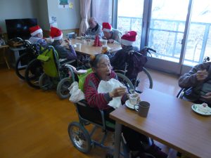 2025年12月25日 クリスマス会 三好園四ツ宮 特養でクリスマス会をしました⛄🎉 玉入れでは応援もあり盛り上がりました😆 皆さんが楽しみにしていたケーキを食べながらお話を楽しみました🍰🍮 最後に、皆さんにクリスマスプレゼントをお渡ししました🎁